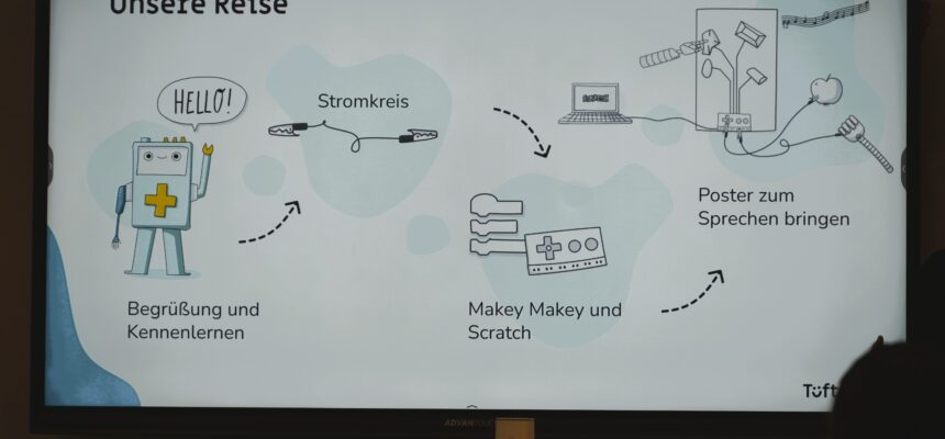 Ein besonderes Highlight: Mit Hilfe eines Mikro-Controllers (Makey Makey) und der Programmiersprache Scratch verwandelten die Schülerinnen und Schüler ihre gestalteten Plakate in interaktive, „sprechende Poster“, die durch selbst aufgenommene Audiodateien lebendig wurden. So lernten sie ganz praktisch, wie Programmierung, Elektronik und kreatives Gestalten zusammenwirken.